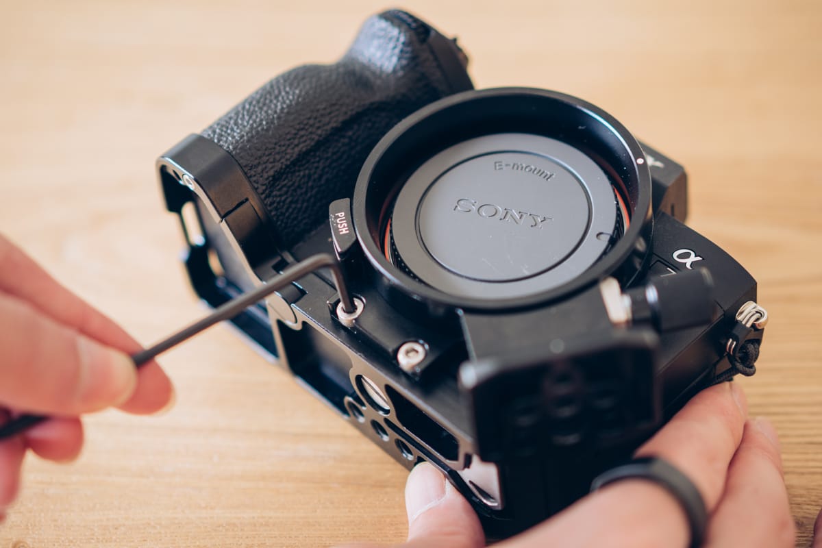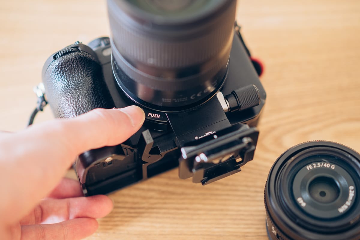 SmallRig 回転式マウントプレートキットはカメラを取り付けた状態でもレンズ交換が可能です。