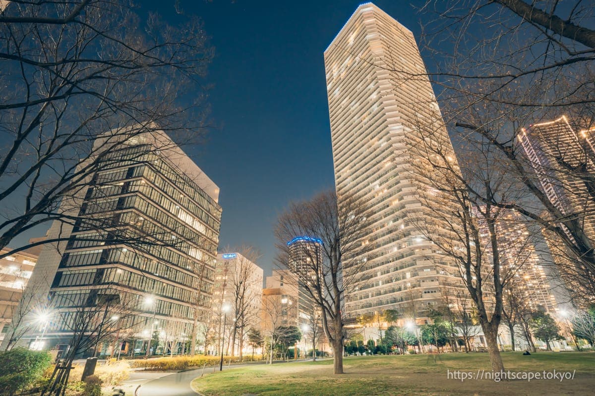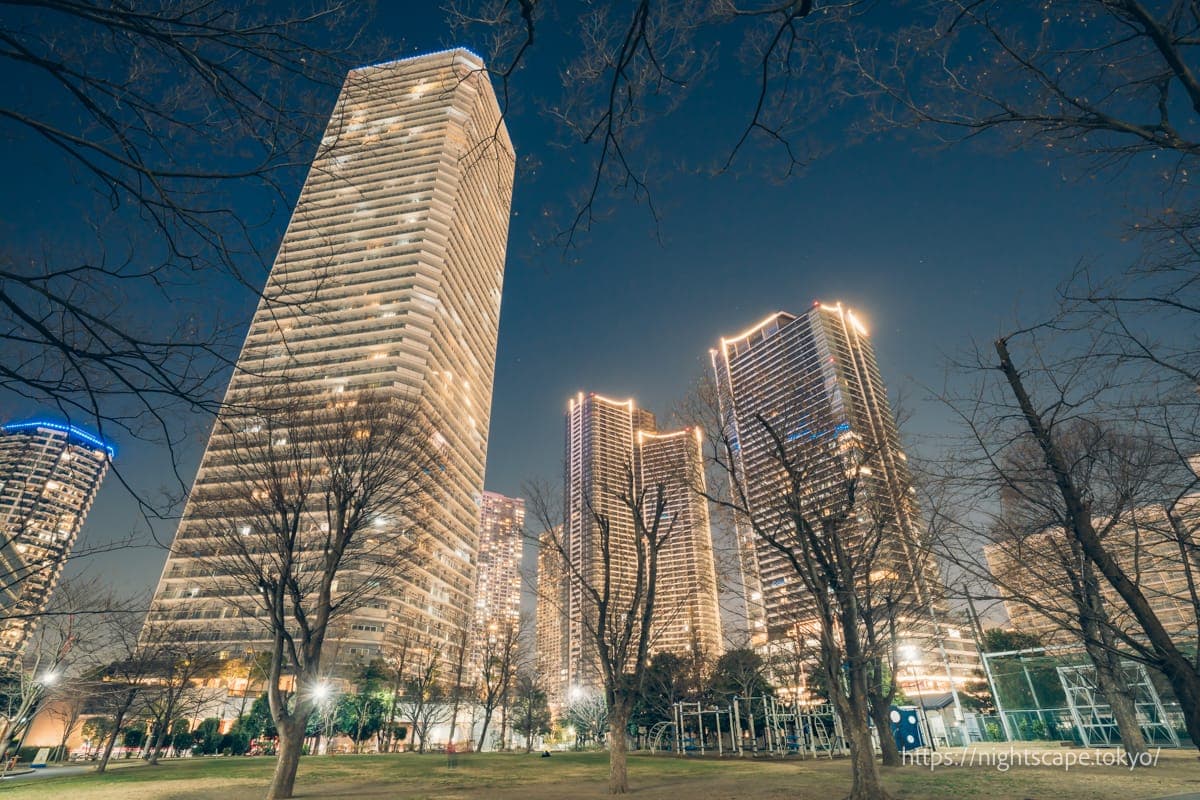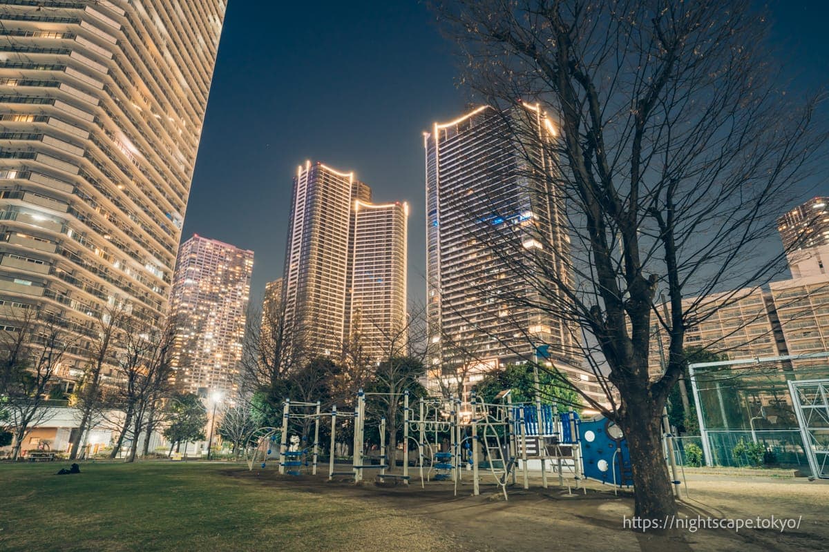 由于路灯较少,夜晚造访时氛围略显昏暗,但因为被晴海城市大厦、杜图尔东塔等高层公寓群环绕,可以欣赏到光量充足的美丽夜景。