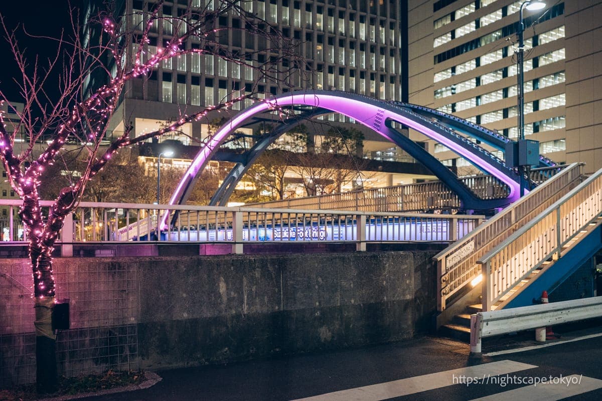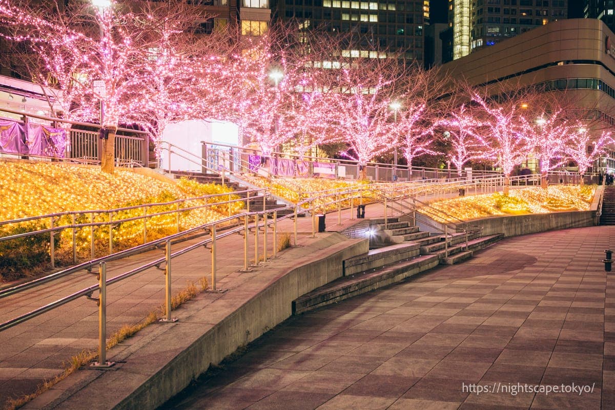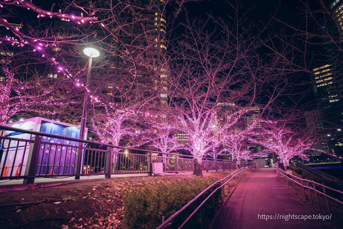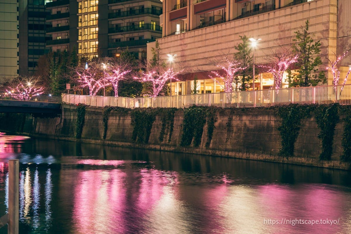 目黑川树木被粉色灯光装饰的景象 目黑川大家的彩灯装饰活动景象 在五反田亲水广场举办的彩灯装饰活动景象 举办彩灯装饰活动的区立五反田亲水广场