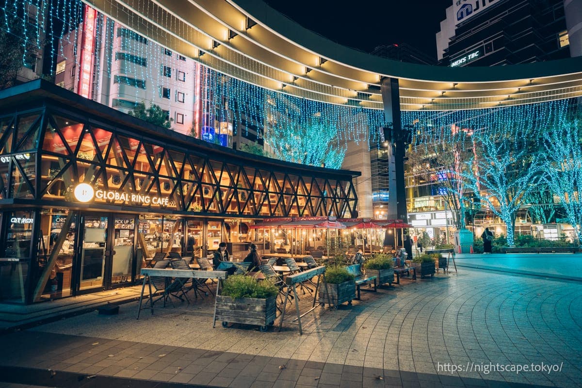 这是一个灯光秀活动,可以尽情欣赏2019年11月在池袋西口公园内新诞生的「环球圆环」散发出翠绿色美丽光芒的景象。