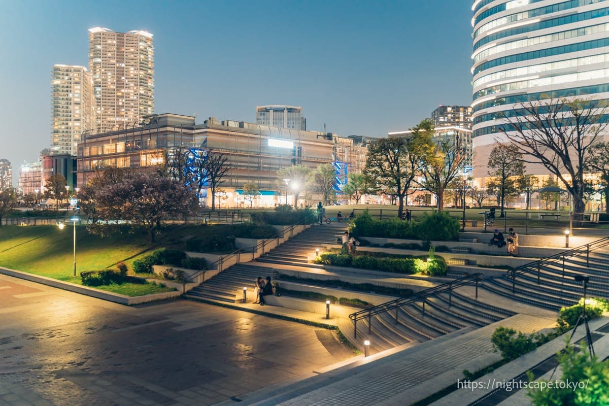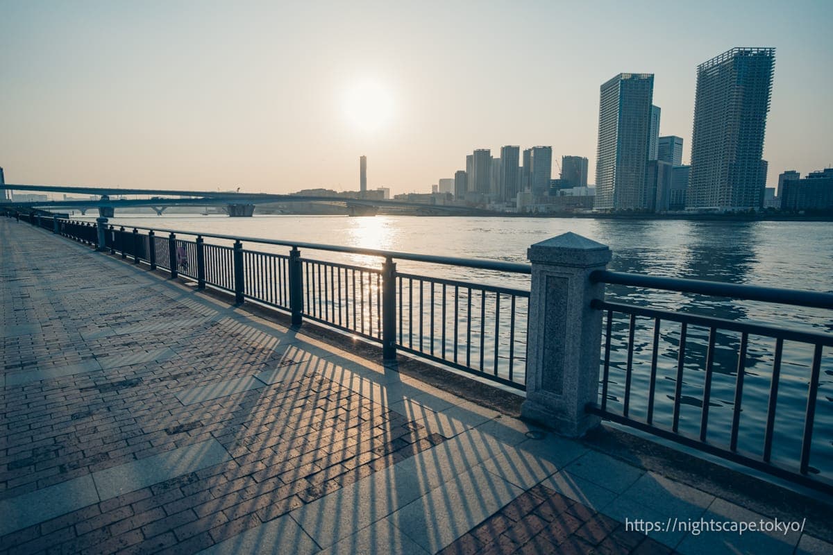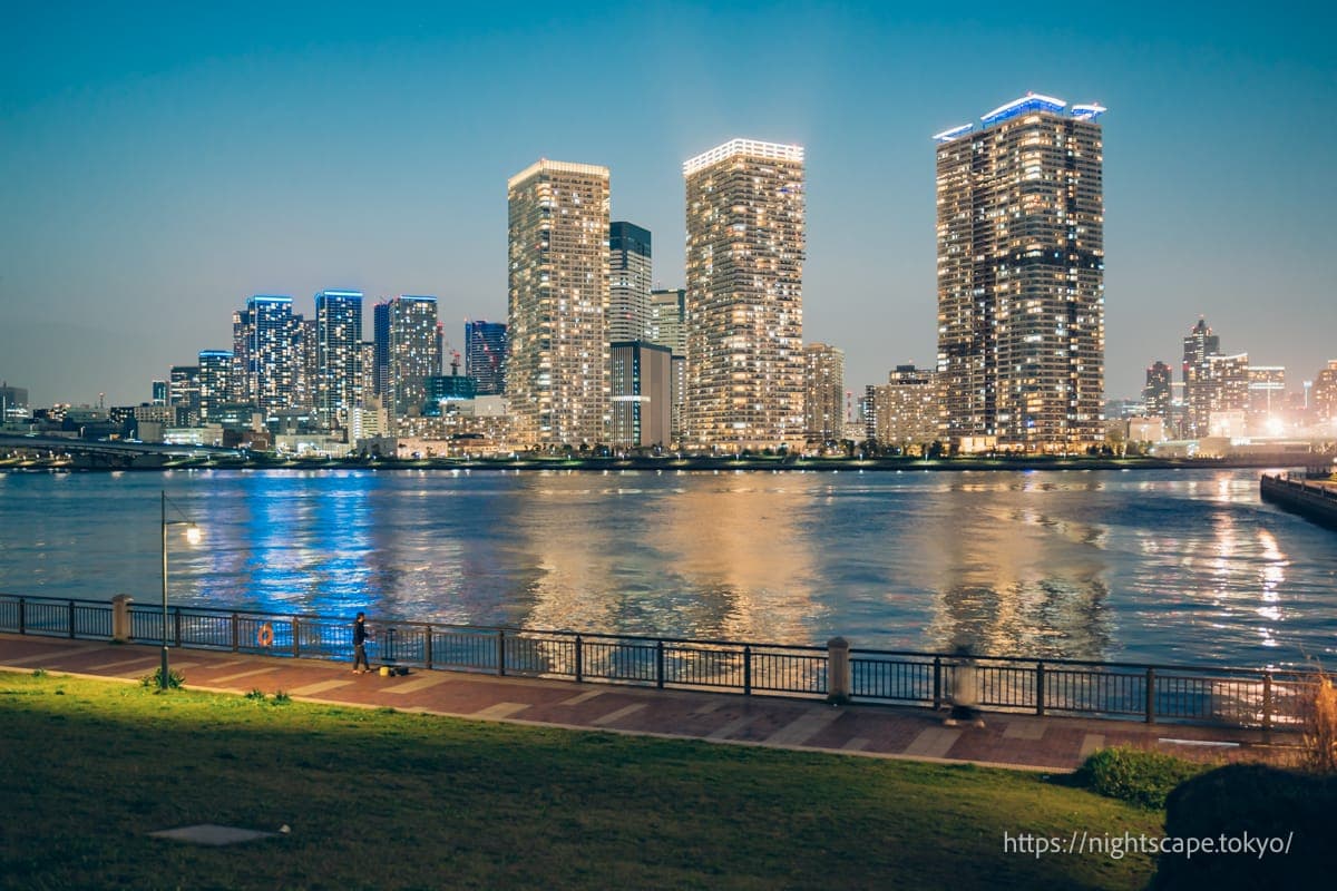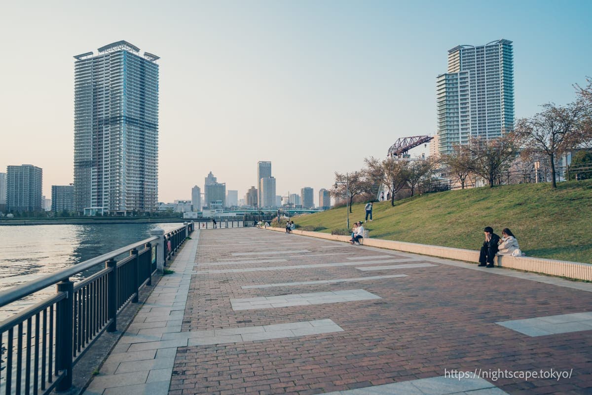 从这个精心整备的公园里,可以欣赏到震撼人心的晴海地区高层公寓群和晴海大桥的景色。