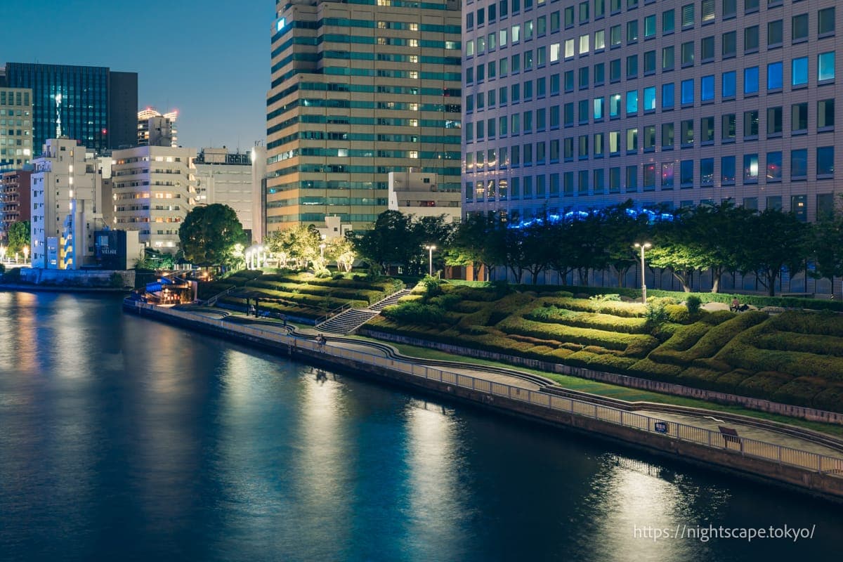 沿朝潮运河整建的步行道。月岛地区高层建筑群交织而成的夜景是这里的看点。