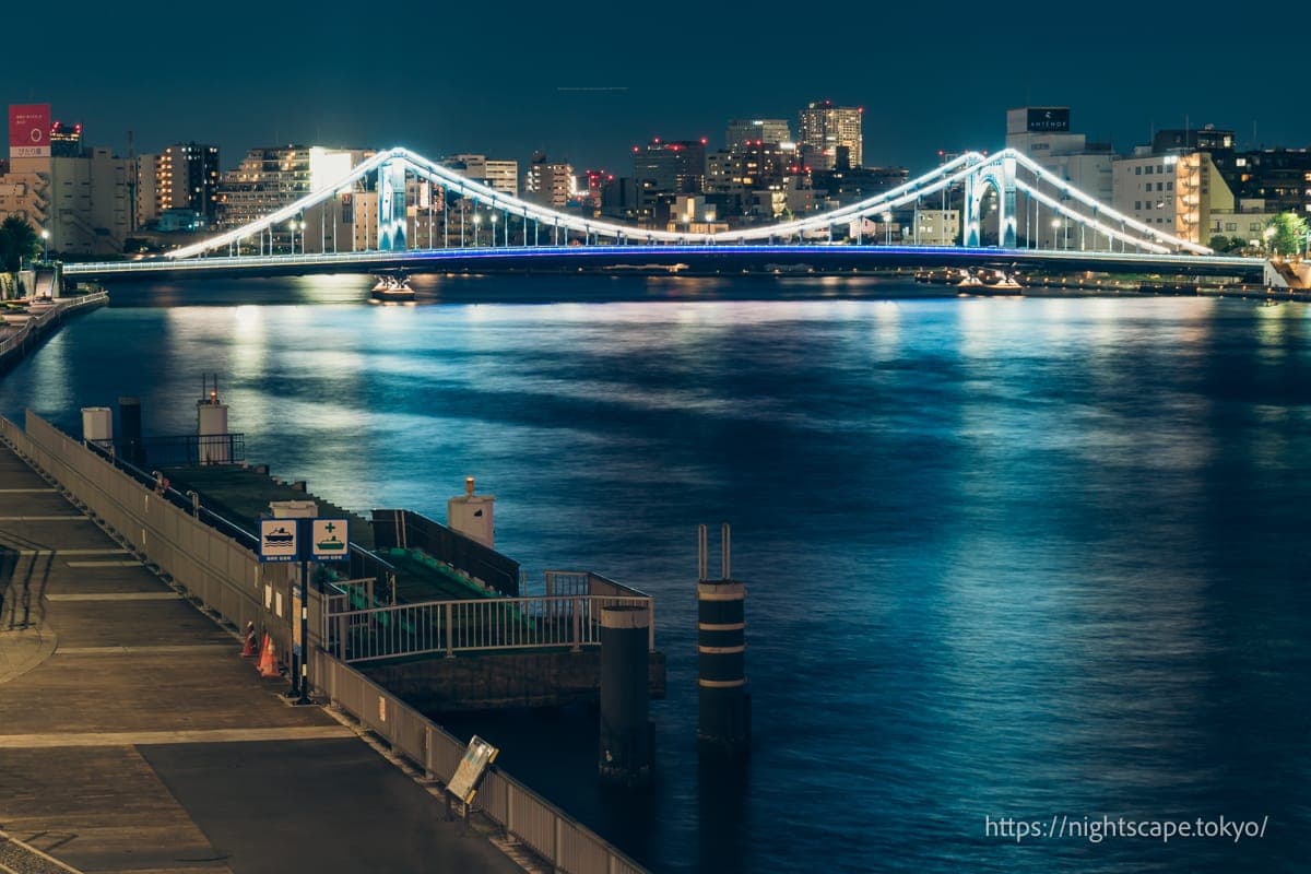 隅田川沿岸有整修得很美观的长距离步行道,除了永代桥之外,还可以欣赏清洲桥、新大桥等各具特色的桥梁灯光。