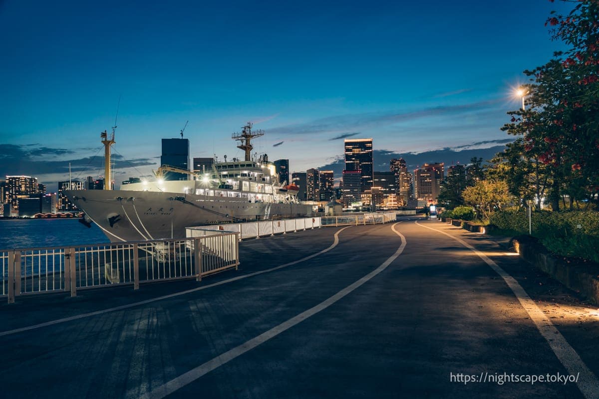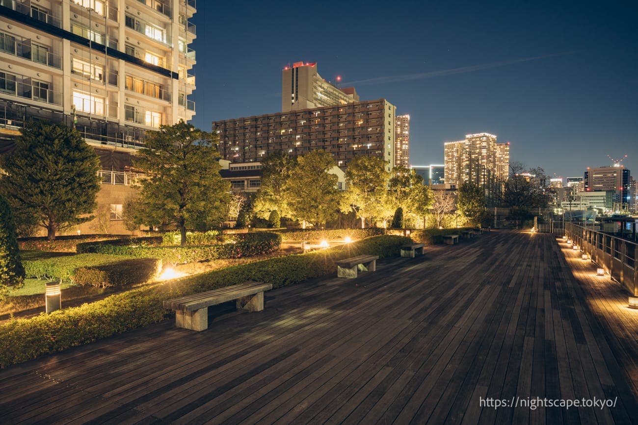 从园内可以欣赏到美丽灯光照明的彩虹大桥、东京塔以及港区地区的建筑夜景。