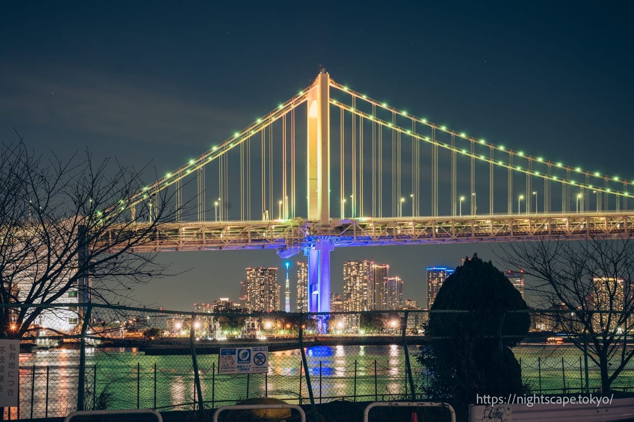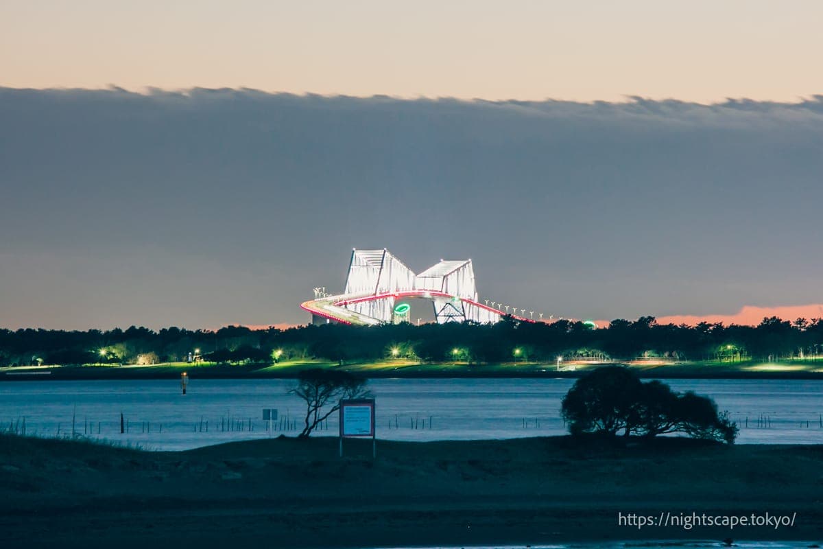 这里是可以免费欣赏东京港湾大桥与富士山重叠绝景的夜景观赏点。每年2月中旬和10月中旬可以观赏到钻石富士山,是众多摄影师聚集的热门地点。