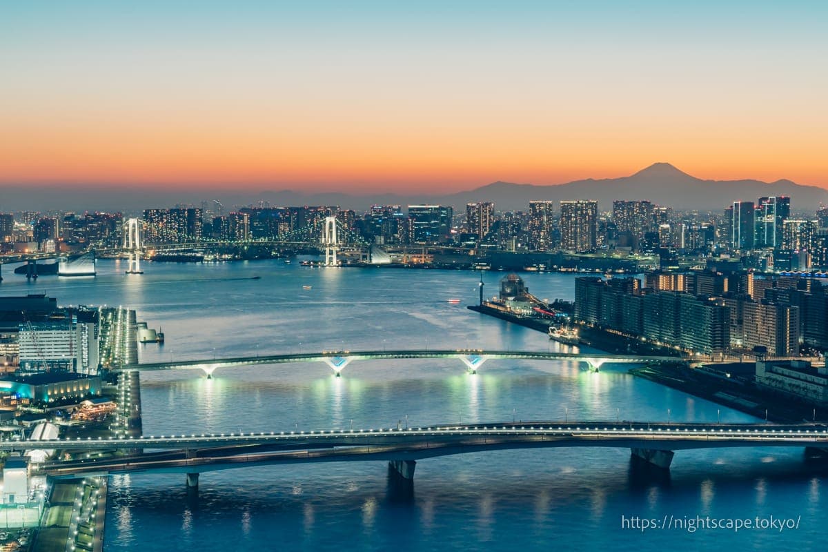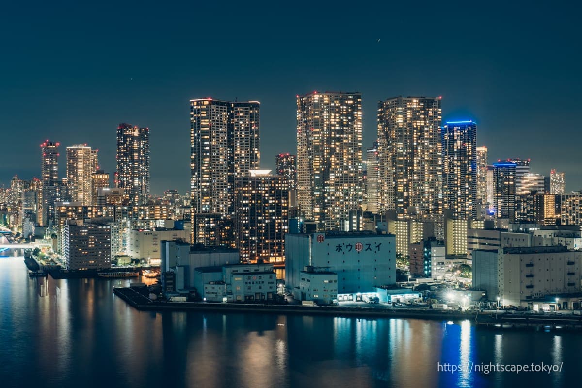 与豊洲站直连、入驻豊洲湾畔交叉大厦33层〜36层的三井花园饭店豊洲高级店。从地上165米的眺望是其魅力所在,黄昏时可以欣赏富士山、彩虹桥、晴海地区高层公寓群的共同演出。36层设有展望室,住宿客人都可以欣赏彩虹桥侧的景观也是其特色。