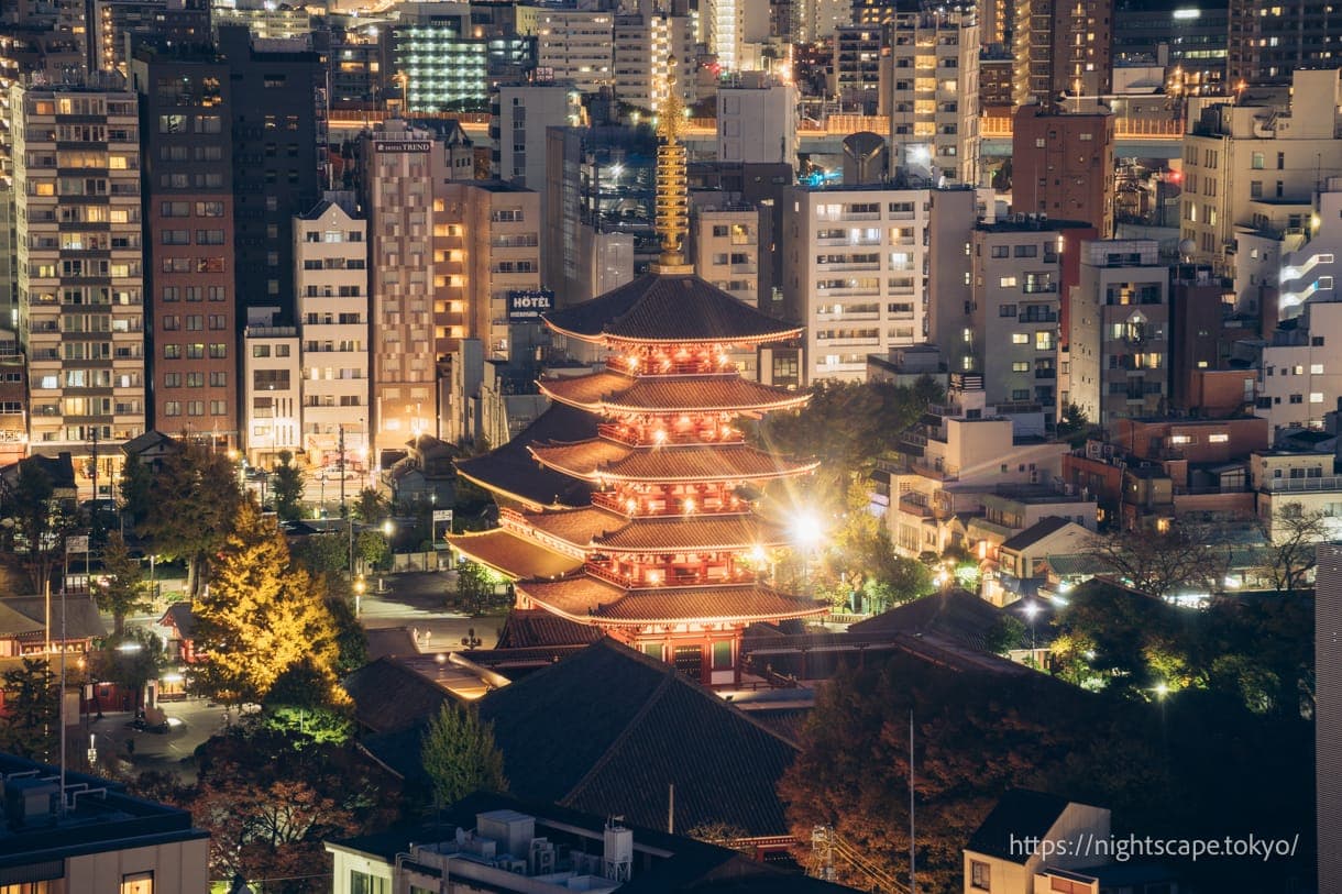 在延续150余年的老字号料亭旧址上2021年开业的簪子东京浅草酒店。从屋顶的天台露台可以俯瞰灯光装饰的东京晴空塔、浅草寺五重塔、浅草花屋敷游乐园。住宿费也很合理,推荐作为浅草观光的据点。