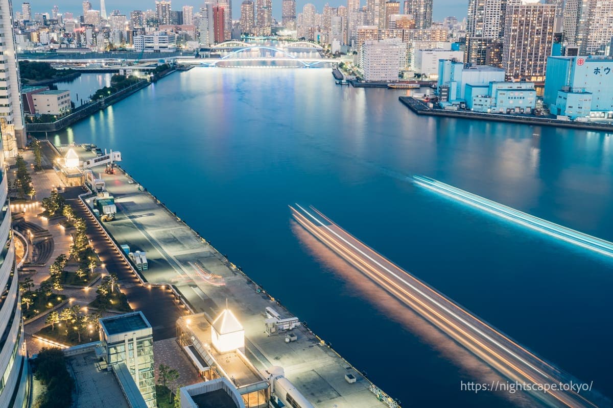 1995年开业的24层五星级酒店——东京湾洲际酒店。河景客房可以眺望隅田川上的築地大桥、胜鬨桥、东京晴空塔等,海景客房可以欣赏壮丽的彩虹桥景观。都内首屈一指的滨水夜景是其魅力所在。