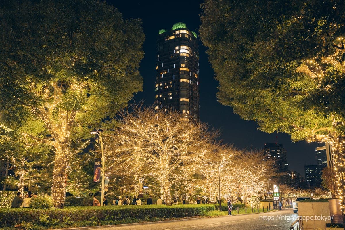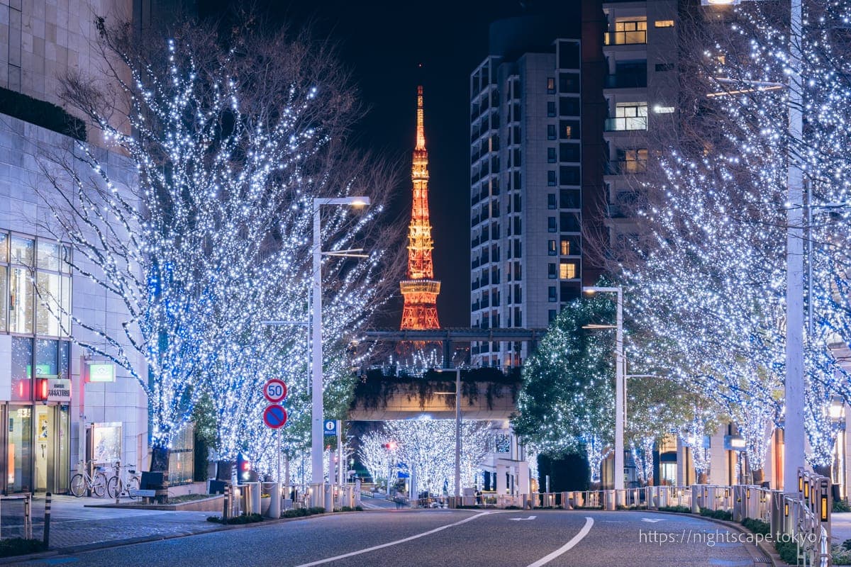 从榉树坂的坡顶可以看到透过光之隧道出现的灯光装饰东京塔,能够欣赏到象征东京冬季的最佳景色。