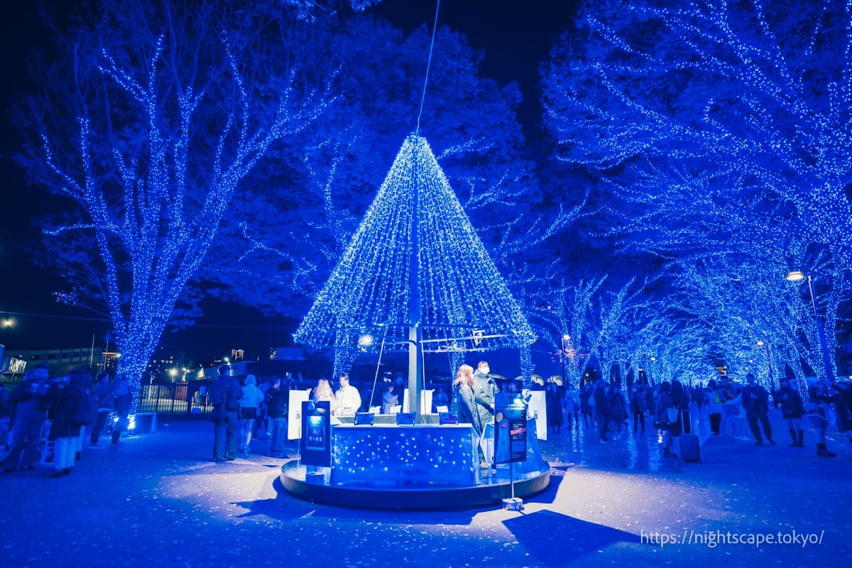 约400米长的榉树林荫道,用象征雪中林荫道的梦幻蓝白色LED和象征蜡烛的温暖暖色系LED色彩绚烂地闪耀。