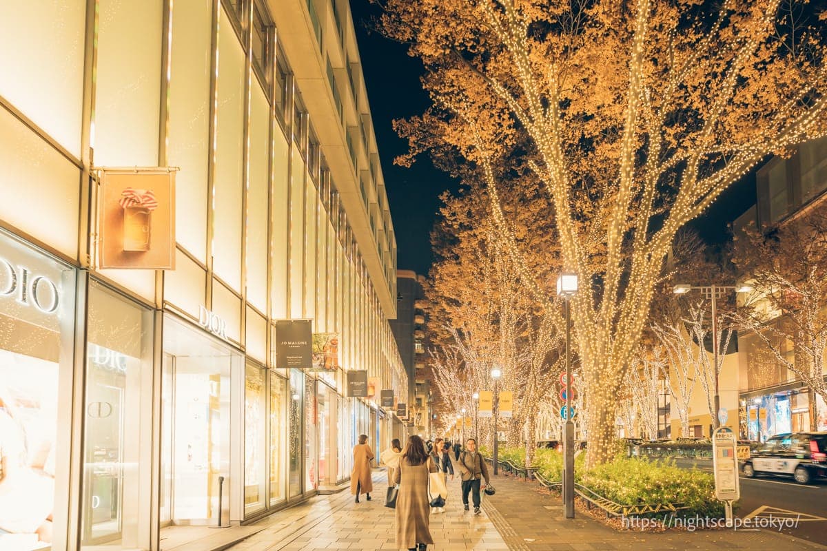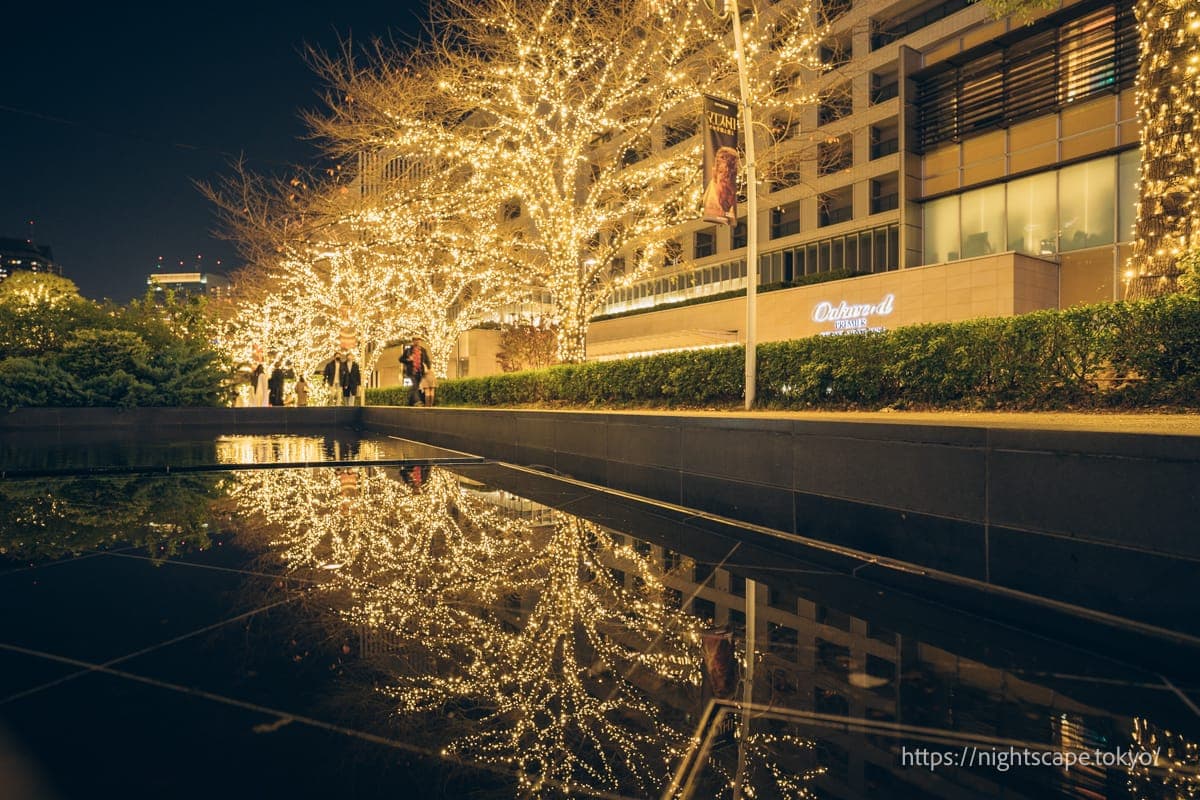特别推荐的是前往乃木坂站方向途中的喷泉区域。金色灯光在水中反射的景象非常梦幻。