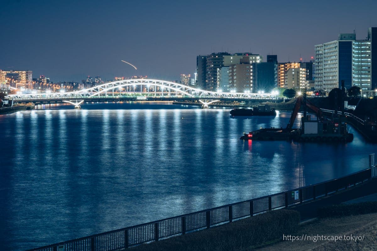 从东北岸眺望桥梁可以看到与东京晴空塔重叠的景象。