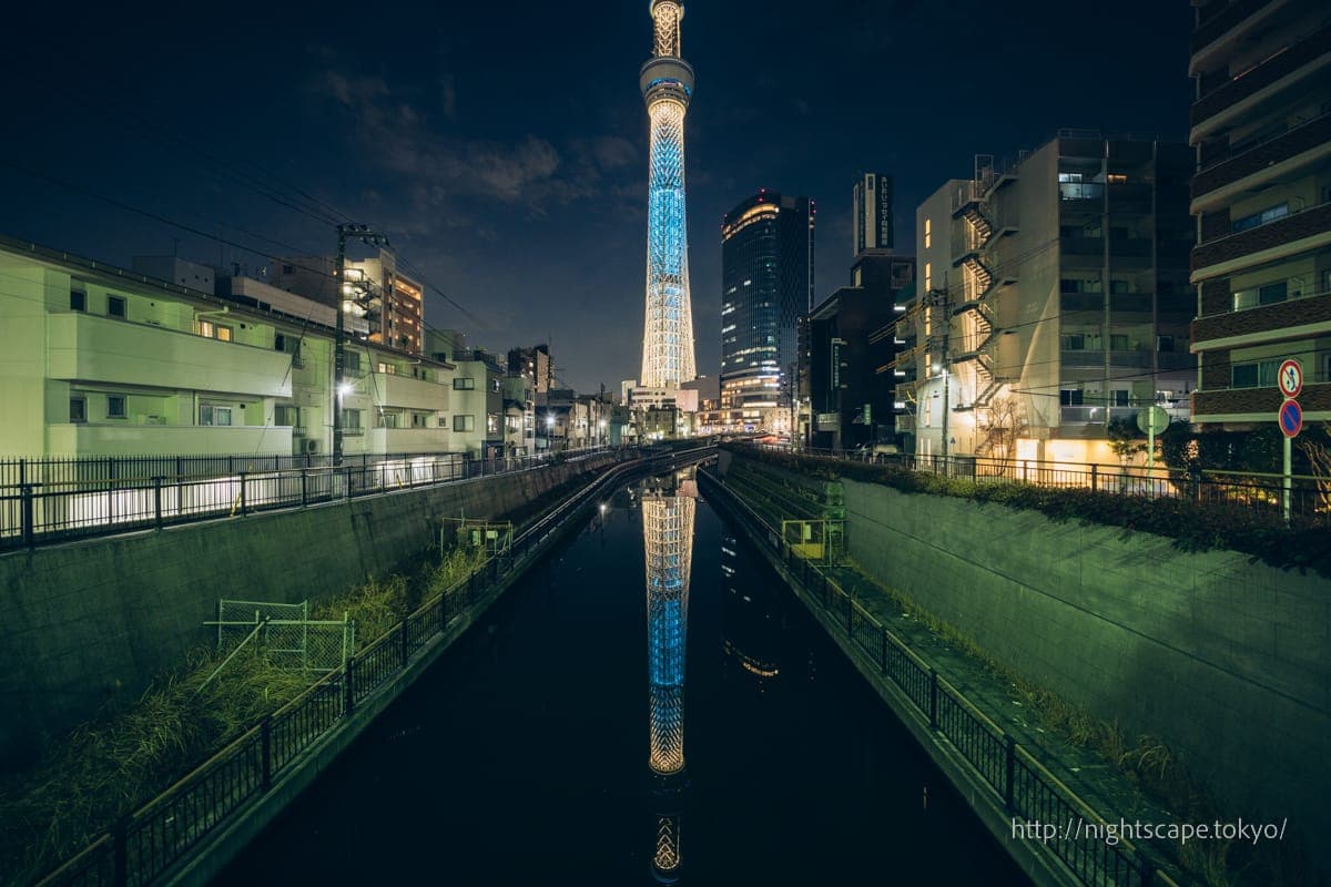 作为拍摄景点推荐从桥东侧朝西正面捕捉晴空塔的构图。