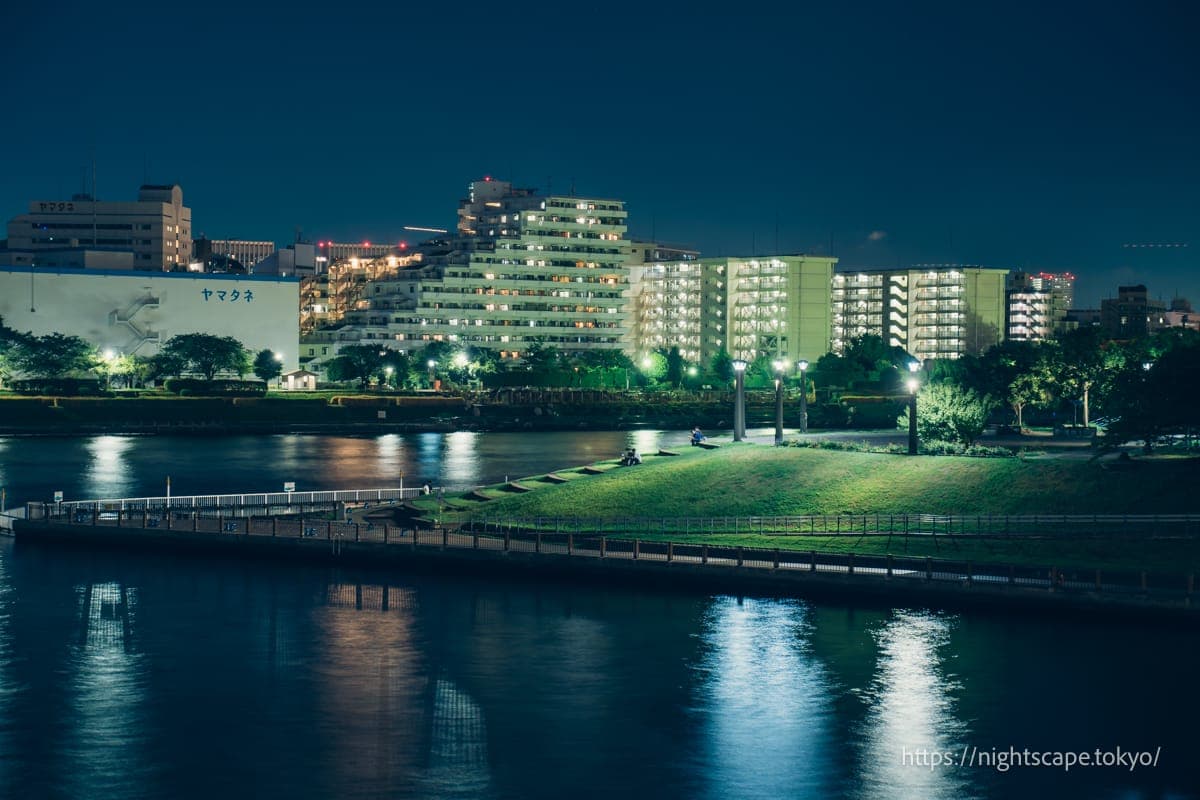 隅田川沿岸步道整备完善,一边眺望倒映在川面的桥梁灯光一边散步格外惬意。