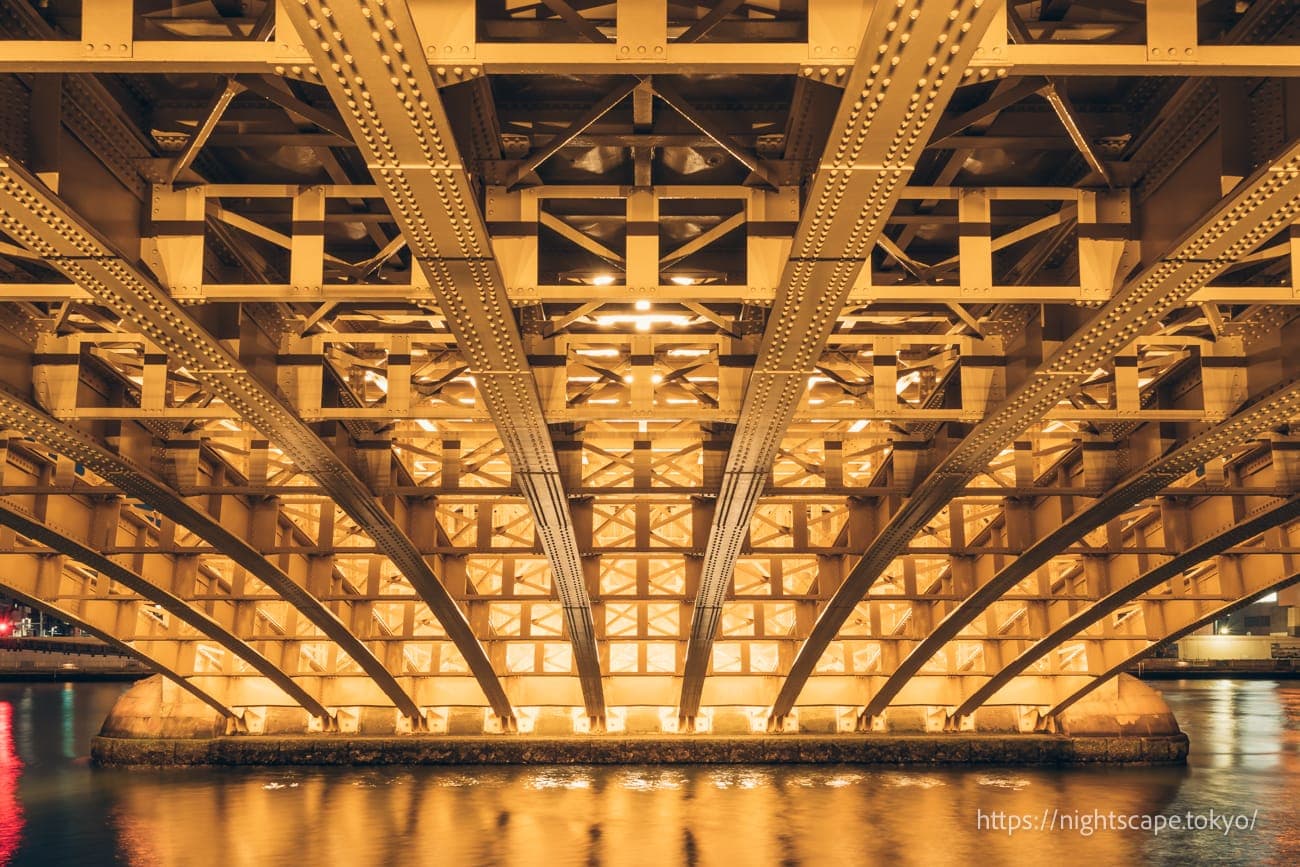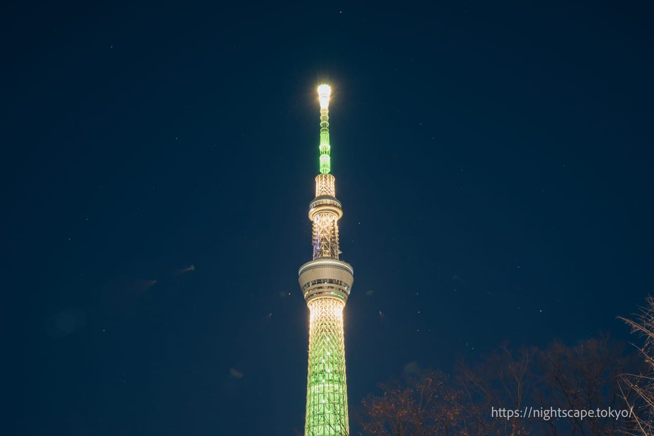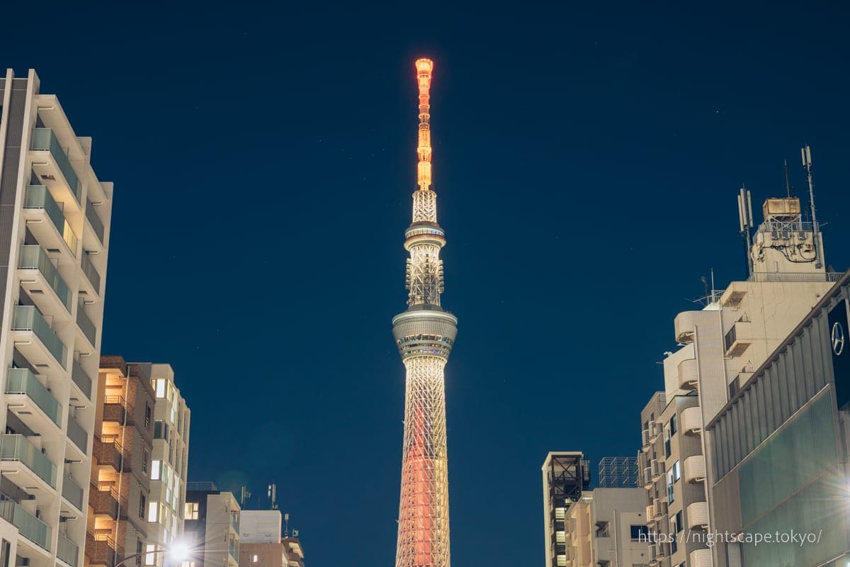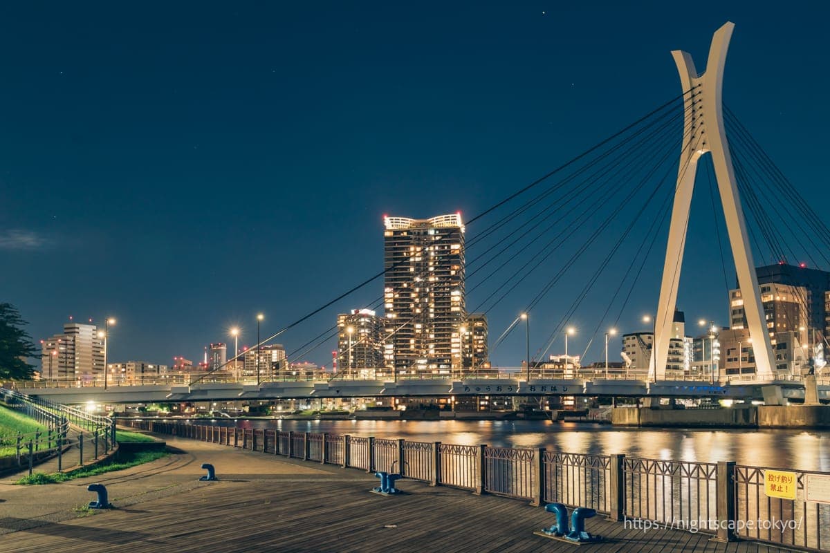 因2020年东京奥运会而开始亮灯的隅田川上的桥梁。与东京晴空塔的共同演出是其看点。