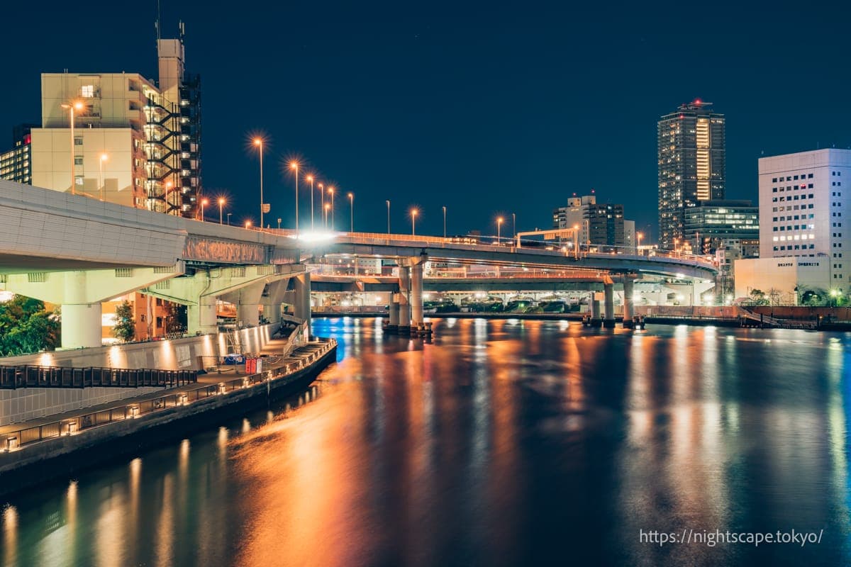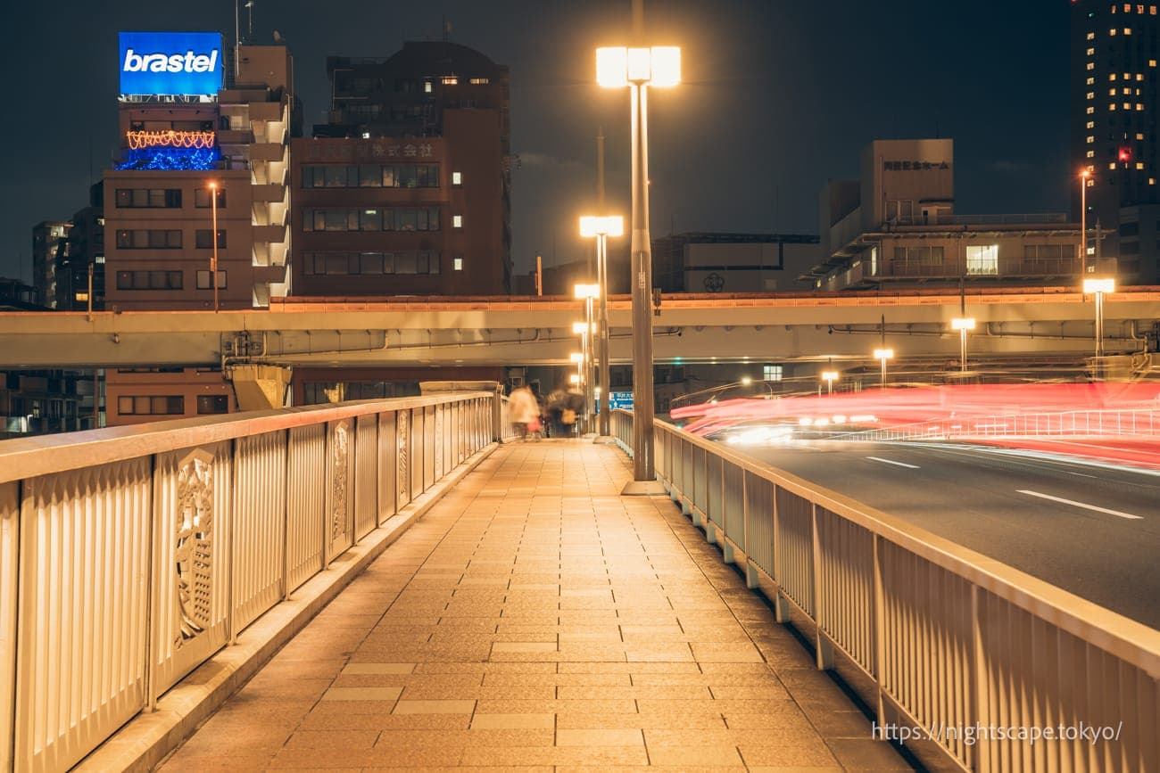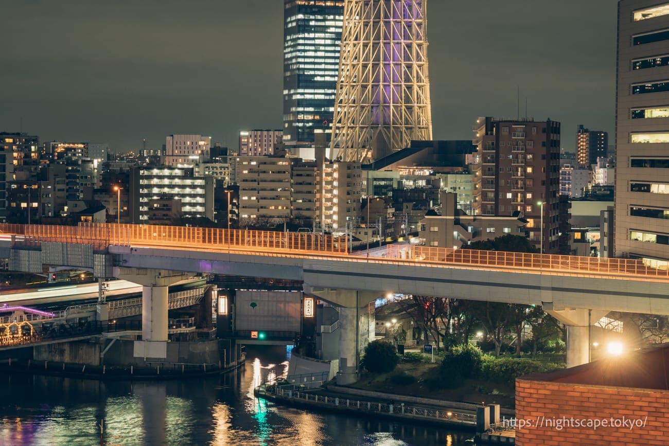 可以在首都高9号深川线正下方步行过桥,欣赏南侧、北侧的夜景。