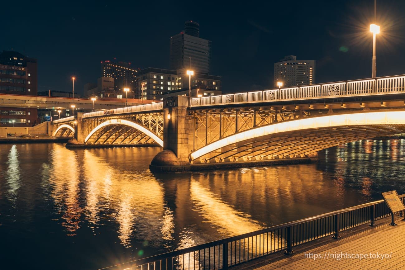 隅田川上唯一的三连拱桥。夜晚白色灯光点亮时,为隅田川夜景增添华彩。从桥上可以眺望东京晴空塔、驹形桥、藏前桥等景点,看点十足。