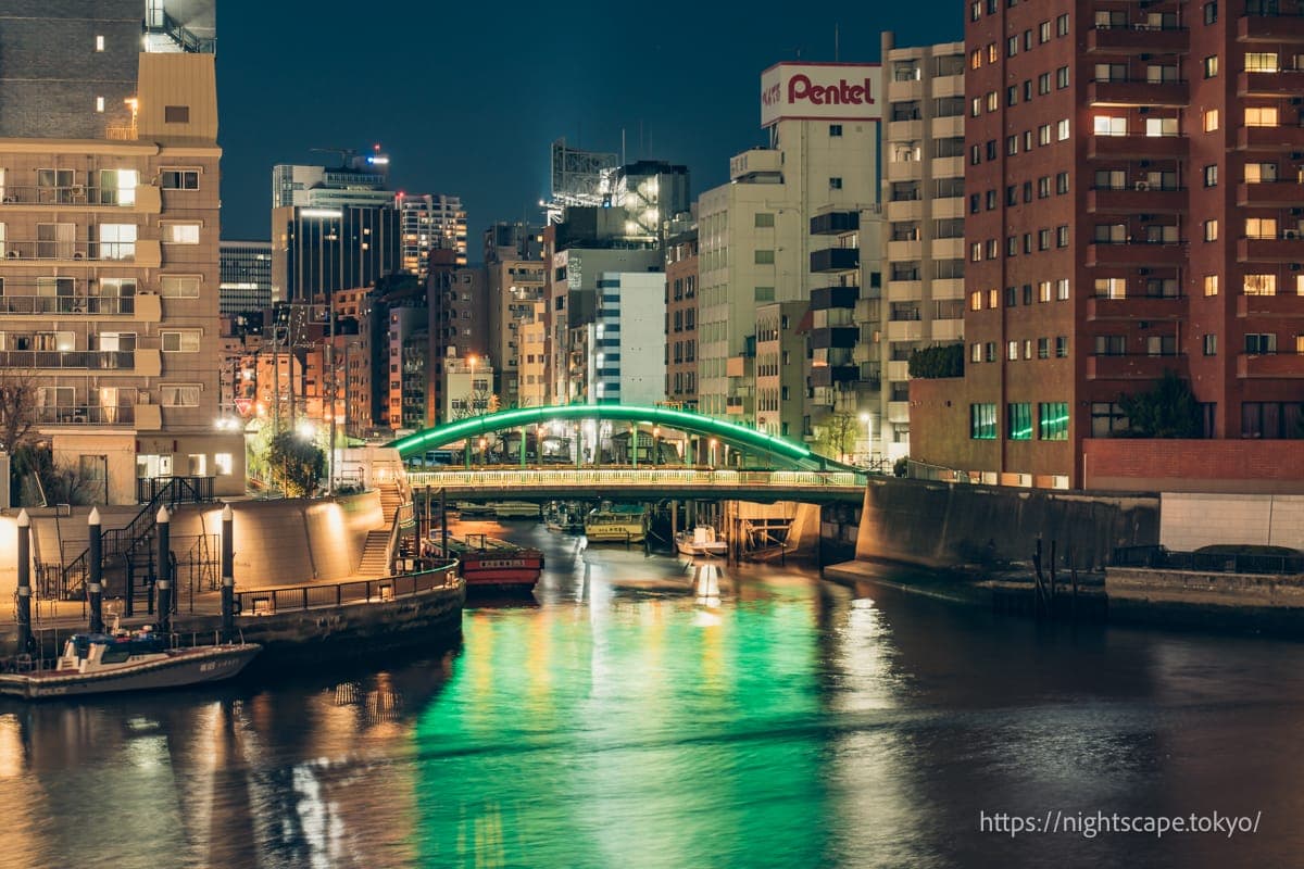 南侧是蓝色亮灯的永代桥和月岛高层公寓群,北侧是亮灯的东京晴空塔和清洲桥等具有东京特色的景观。