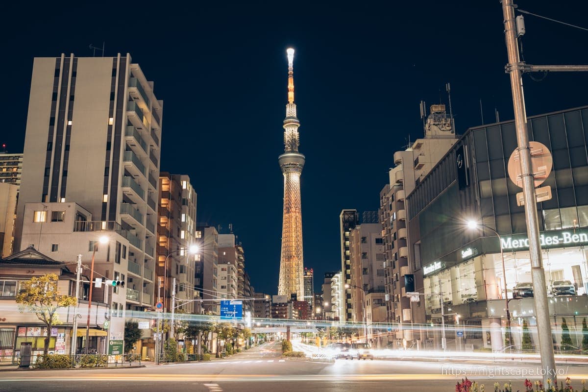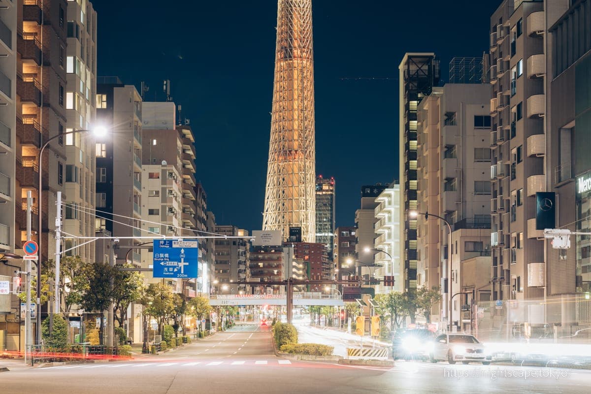 东京晴空塔位于东侧,建议早起拍摄日出前的景色。