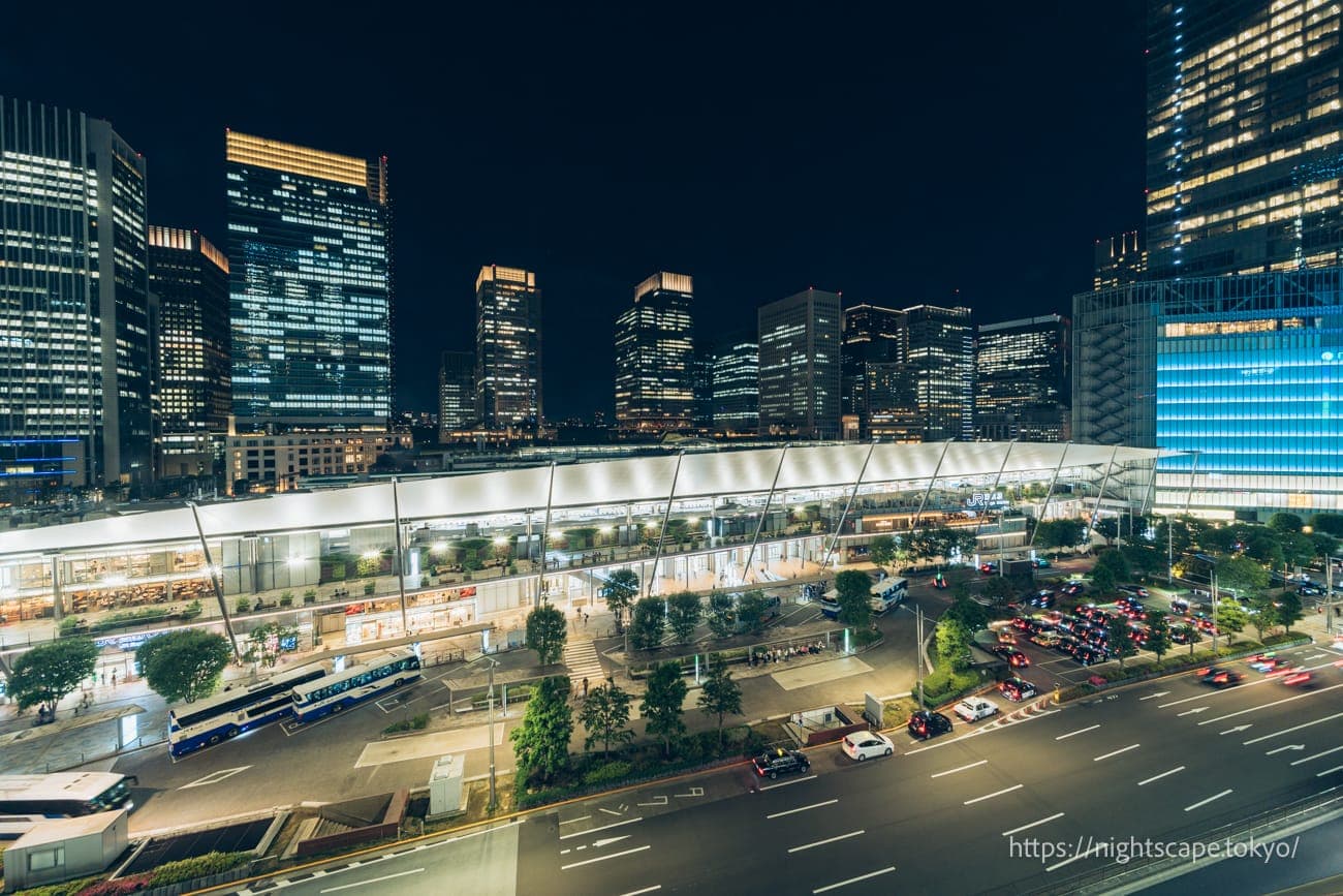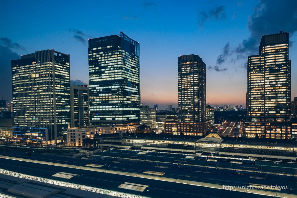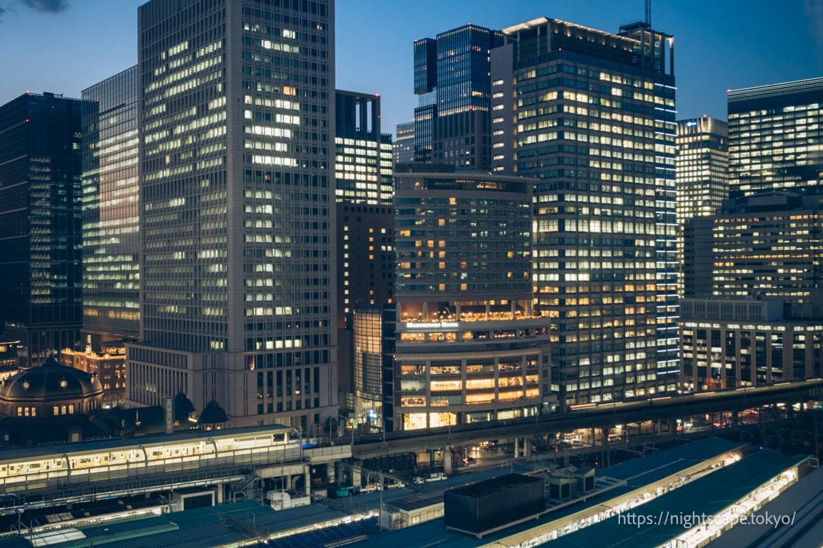 东京站和丸之内地区高层建筑群交织而成的夜景极具震撼力。