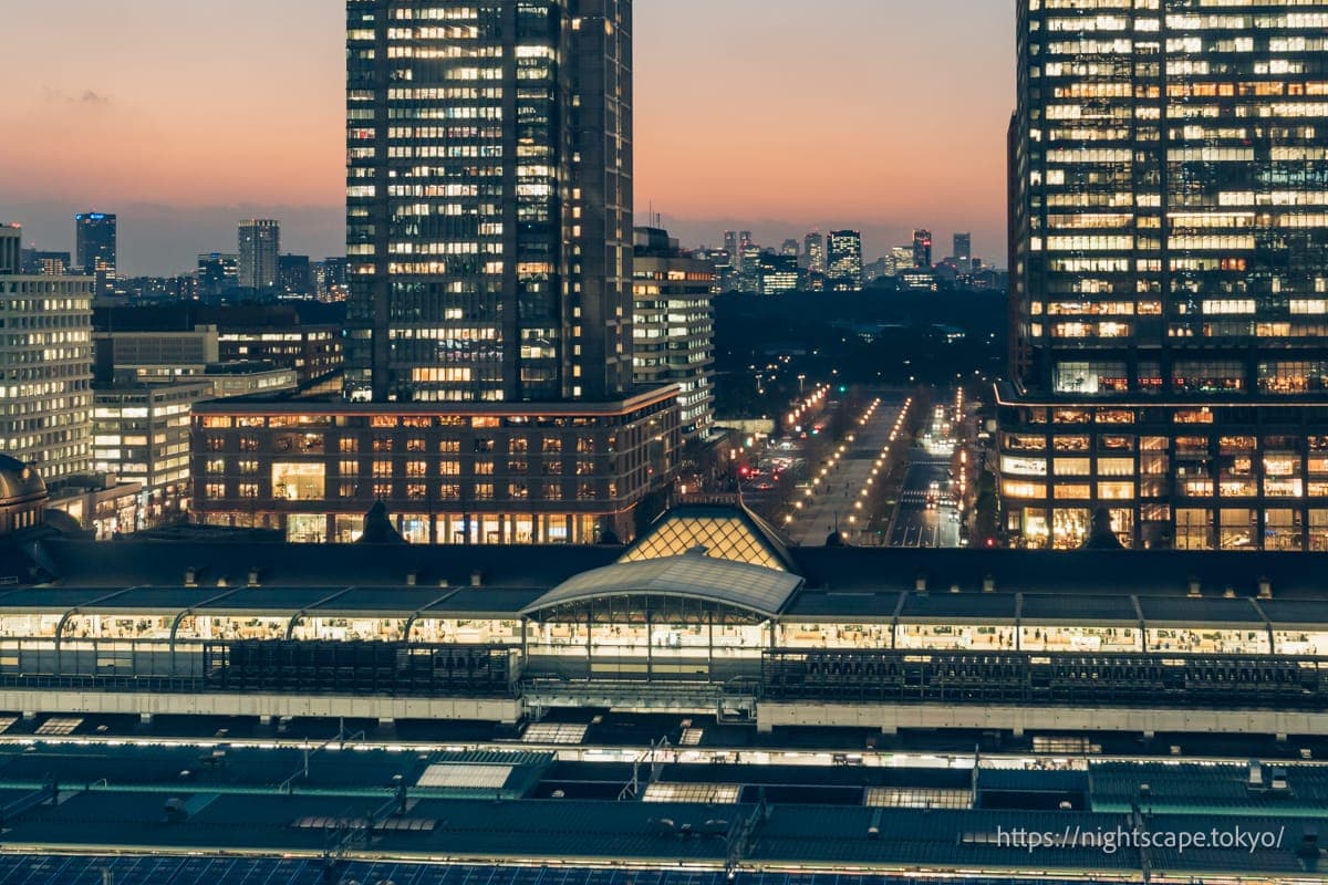 在这条美丽整备的道路尽头可以看到灯光装饰的东京站,两侧还能眺望到象征千代田区的高层建筑。
