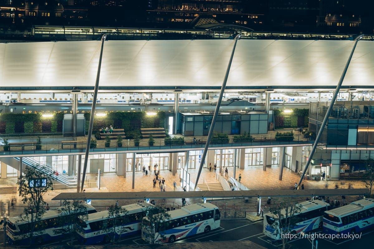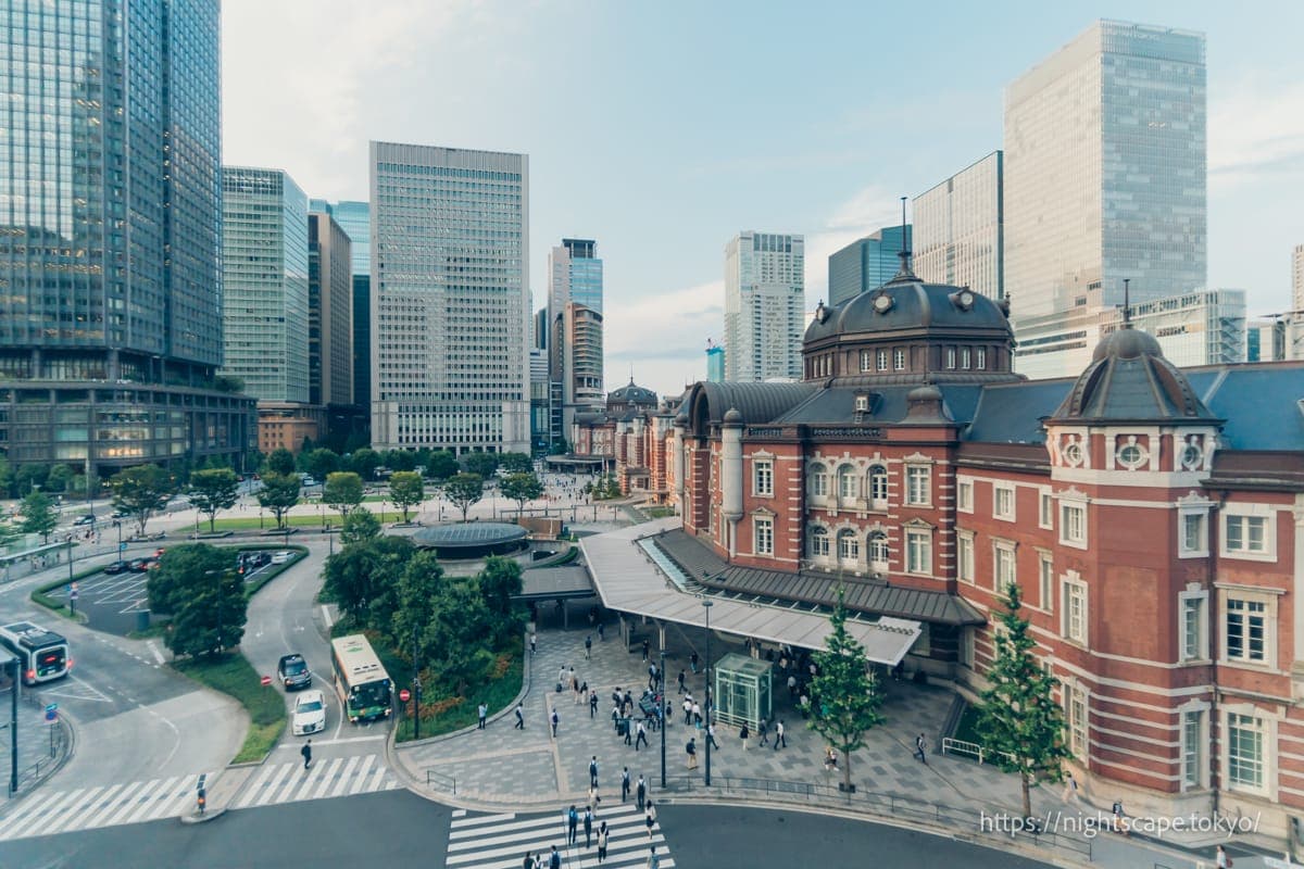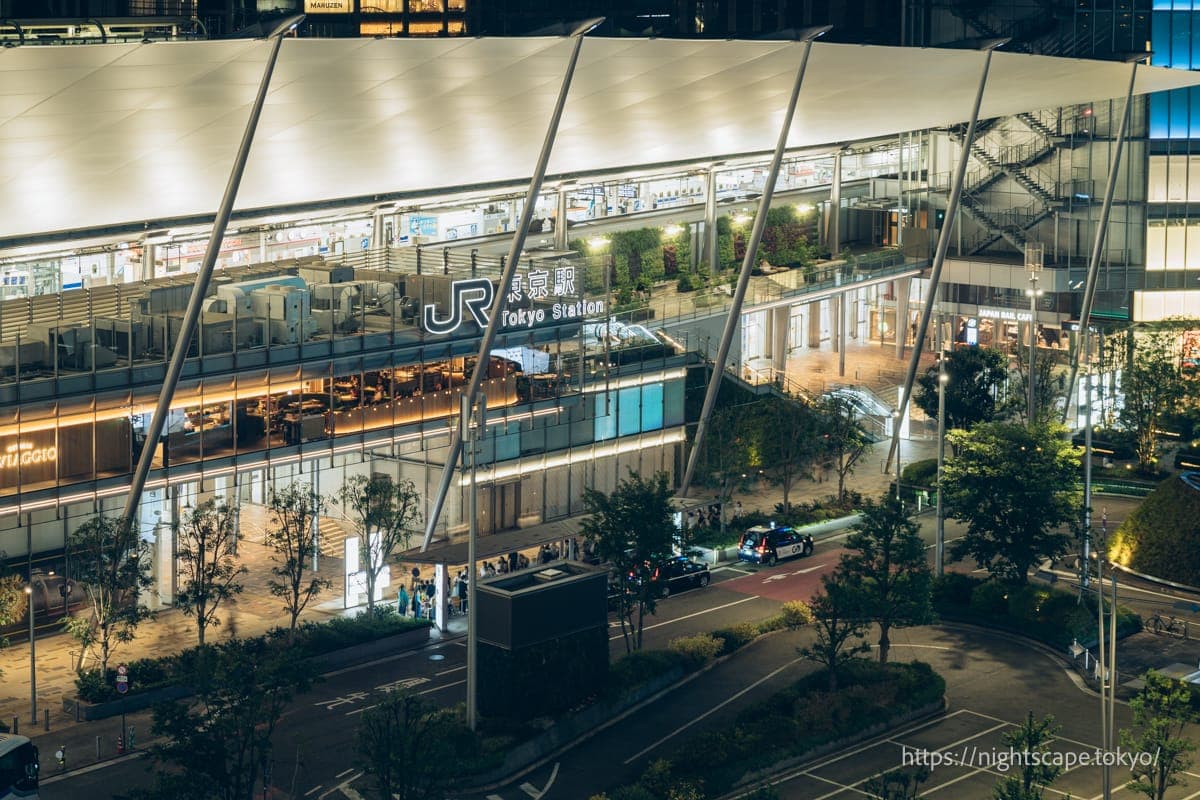 可以俯瞰全长335米东京站的免费夜景景点。露台开放时间到晚上8点,时间稍早,想去的朋友需要注意。